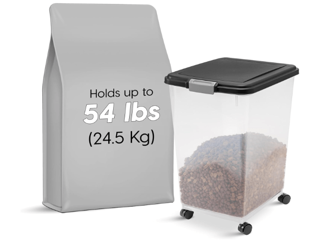 While supplies last, you can purchase an IRIS USA Airtight Dog Food Storage Container, Up to 54 lbs, Attachable Wheels, For Dog Cat Bird and Other Pet Food Storage Bin, Keep Fresh, Translucent Body, Easy Mobility, Black for just $26.28 on Amazon with Free Shipping for Amazon Prime Members.