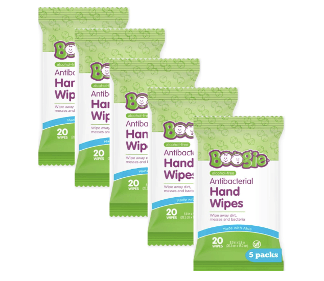 While supplies last, you can purchase a Boogie Antibacterial Hand Wipes by Boogie, Alcohol Free, Hypoallergenic and Moisturizing Aloe, Hand Wipes for Kids and Adults -100 Total Wipes (5 Packs of 20) for just $9.98 on Amazon with Free Shipping for Amazon Prime Members.